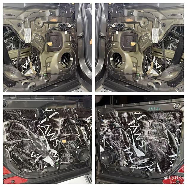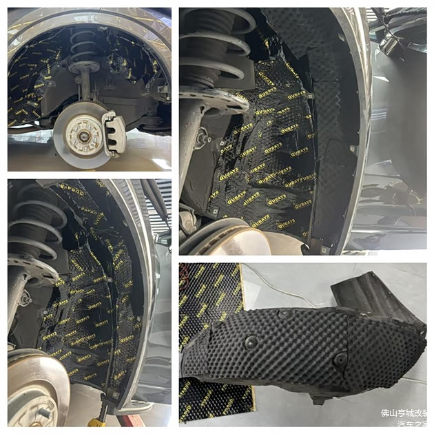 四轮隔音则选用音古贝斯材料搭配全方位加密工艺,从源头削弱胎噪与路噪的传递路径。四轮隔音更是做到了极致细致,音古贝斯材料的铺设覆盖全面,全方位加密工艺进一步提升了隔音屏障的完整性,从车轮拱罩到周边缝隙均进行了严密处理,最大程度减少胎噪与路噪的传递。无论是门板内层的细致贴合,还是四轮部位的全面防护,每一处施工细节都体现了佛山亨城的专业匠心。
