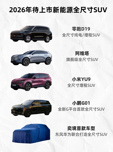 2026年的全尺寸旗舰最激烈的战场应该是30万以下价位了 零跑D19、小鹏G01、还有东风和华为联手的奕境首款全尺寸SUV,这也是被各大潜在买家认为是2026年必蹲的新车。东风的造车背景+全尺寸+华为智能化,买点很充分。奕境的含“华”量和鸿蒙智行是看齐的,官方定位“最懂家庭的智慧伙伴”,所以在生态这方面的合作可能会更深入。