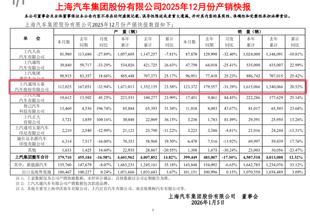 上汽集团发布的最新产销快报数据显示,2025年全年,上汽通用五菱的累计销量达到1615066辆,同比上涨20.52%。然而,这张光鲜的成绩单背后,11月和12月连续两个月的销量同比下滑,是否为这家国民车企的转型之路投下了一缕阴影,值得观察。
