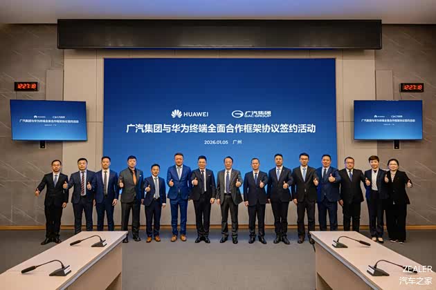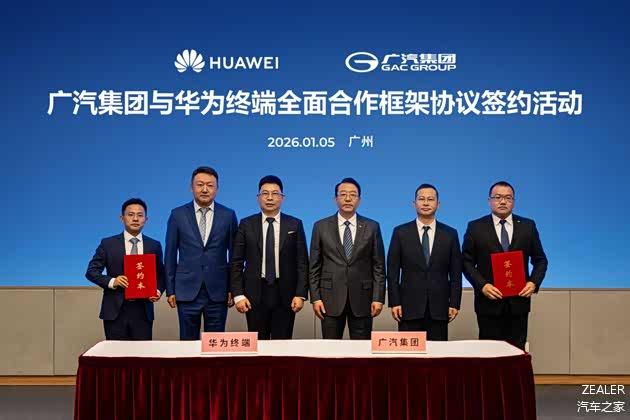 2026年1月5日,广汽集团与华为终端在广州签署全面合作框架协议,标志着双方战略合作进一步升级至生态融合新阶段。华为常务董事、终端BG董事长余承东一行到访广汽集团番禺总部,与广汽集团董事长冯兴亚等高层就智能汽车技术演进、产业协同等议题展开深入交流,并为签约仪式见证。