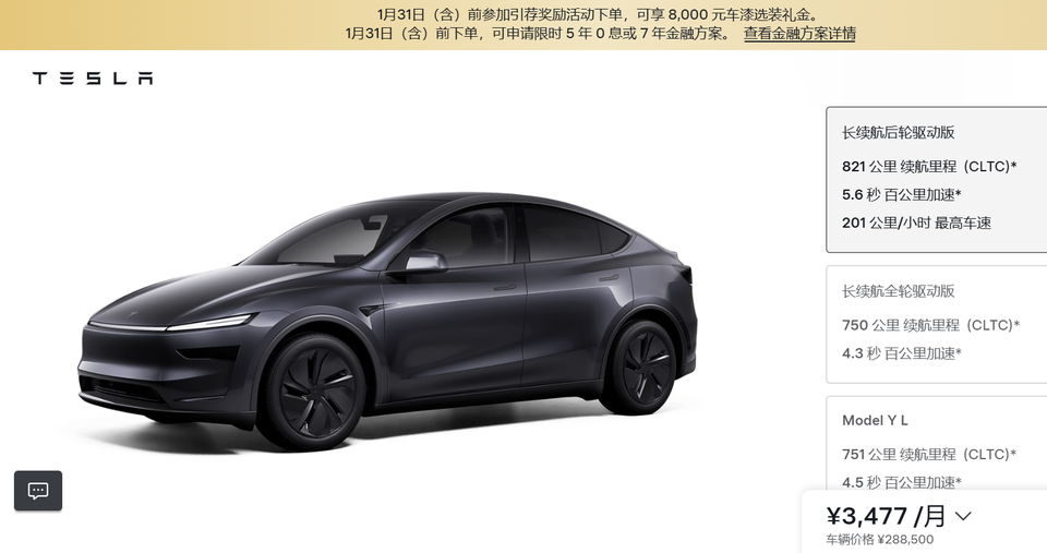 1月6日,特斯拉中国为购买Model 3和Model Y、Model Y L车型提供5年0息方案。具体来看,Model 3/Y首付7.99万起,月供可低至1918元;Model Y L首付9.99万起,月供可低至2947元。这里尤其要说的是Model Y L,是首次给用户提供免息政策,非常有吸引力。