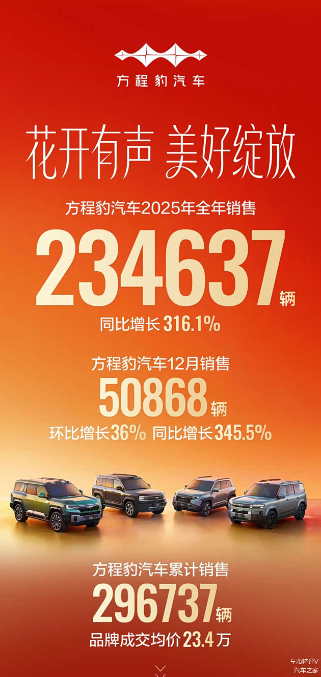 2025年,方程豹总计销量234637辆,同比猛涨316.1%。在12月收官之战中,方程豹销量50868辆,环比增长36%,同比大涨345.5%。自推出市场以来,方程豹累计销量296737辆。