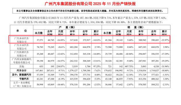 毕竟,从广汽本田目前的市场表现来看,其在中国车市应该承受了一定的压力或者挑战。从广汽集团发布的产销快报来看,2025年1-11月份,广汽本田销量呈现出一定幅度的下滑态势。