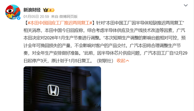 媒体消息显示,广汽本田近日决定推迟其工厂的复工时间,从原计划的1月5日复工延后至1月19日。 本田中国对此回应称,此举是“综合考虑半导体供应及生产线技术改造等因素”后对生产节奏的调整。公司表示,本次调整的影响可控,预计全年可挽回损失的产量,且不会影响产品交付。