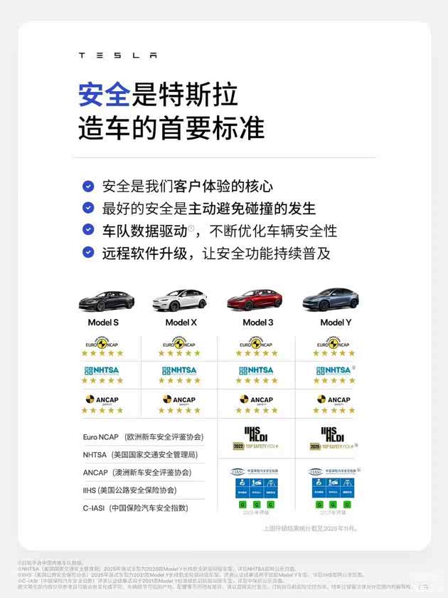 2025年,现款Model Y 斩获2025年Euro NCAP(欧洲新车安全评鉴协会)、ANCAP(澳洲新车安全评鉴协会)“五星安全”评级。作为全球车型,S3XY全系车型满足全球多个市场的严苛标准,已在美国NHTSA、欧洲Euro NCAP、中国C-IASI、澳大利亚ANCAP等多个权威机构中获得“五星安全”评级。