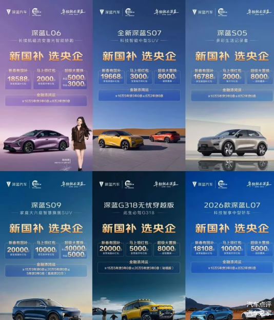 除此之外,五菱、长安马自达、深蓝、东风风神、星途等品牌则将购置税补贴,叠加置换补贴与金融贴息作为核心组合拳。五菱银标旗下新能源车型享购置税全额补贴,叠加至高8000元置换补贴和5000元金融贴息。长安马自达CX-50行也焕新一口价13.98万起,EZ-60运动版至高享2万元以旧换新国补。深蓝汽车推出至高2万元国补红包、1万元开年红包等四重优惠。东风风神L8以8.8元抢至高5000元购置税补贴的营销噱头吸引流量,叠加1.5万元置换补贴。星途2026款揽月超越版和凌云超越版分别推出2.5万元和3万元现金优惠,搭配置换和金融政策。