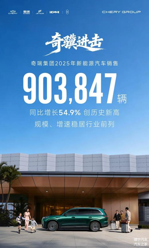 从权威统计数据中可以清晰窥见奇瑞新能源业务的强劲增长势头,2025年全年,奇瑞新能源汽车累计销量达到903,847辆,这一数字不仅刷新了品牌新能源板块的历史最高纪录,更实现了高达54.9%的同比增幅。在激烈的行业竞争中,这样的规模与增速表现,让奇瑞稳稳跻身行业前列阵营。尤其值得关注的是,自2025年11月起,奇瑞新能源汽车批发销量就已经成功闯入行业前三甲,这一突破性进展,标志着奇瑞集团新能源业务已正式迈入行业第一梯队,成长潜力与发展韧性有目共睹。