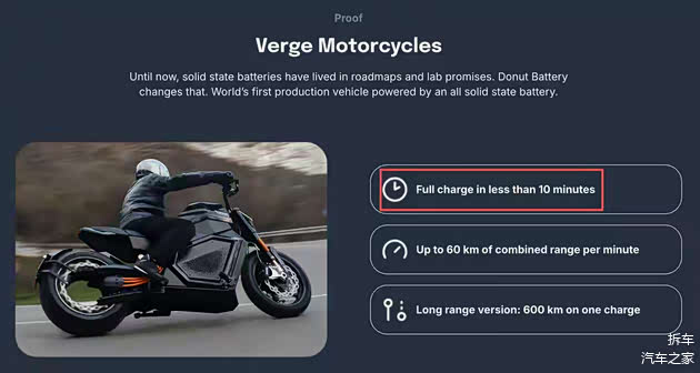 Donut Lab声称这款全固态电池已准备好投入实际应用,并将于2026年第一季度开始为Verge Motorcycles的摩托车型提供动力。Verge方面称,其升级款TS Pro摩托车将于今年第一季度开启交付,届时将成为全球首款使用全固态电池驱动的量产电动车。据悉,在电池仓体积不变的情况下,换装全固态电池后,TS Pro摩托车的续航里程将从原来使用传统锂离子电池时的217英里提升至370英里,且充电时间不到10分钟。