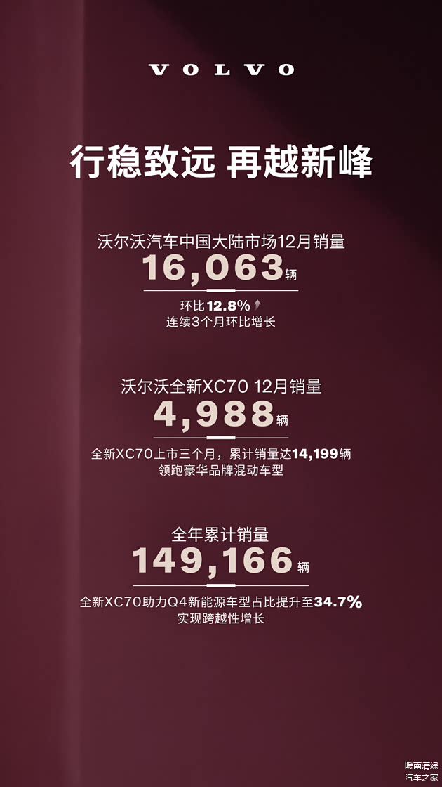 沃尔沃汽车官方数据显示,2025年12月中国大陆市场单月销量达到16,063辆,相比上月环比增长12.8%。同时,全年累计销量成功突破149,166辆,为品牌在豪华汽车市场中的稳定发展注入了更多信心。