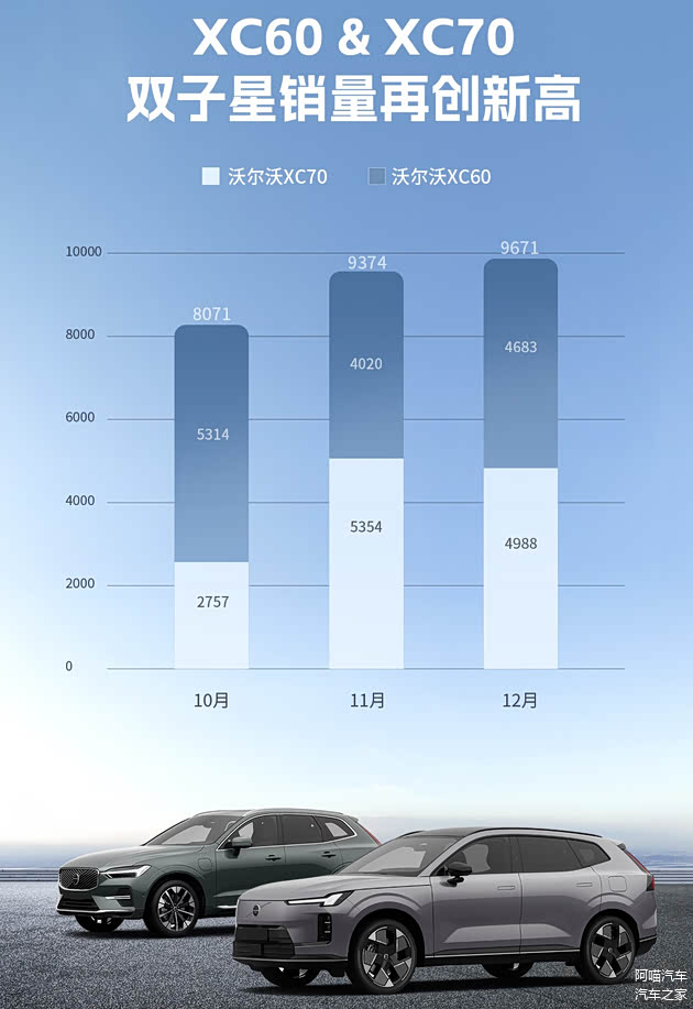 沃尔沃XC60作为品牌经典车型,12月销量达到4,683辆。XC70与XC60组成的“双子星”组合在12月合计销量近万辆。
