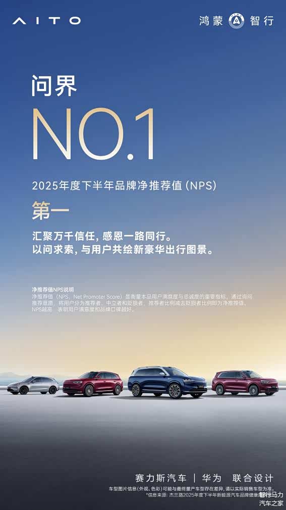 近日,杰兰路咨询发布《2025下半年新能源汽车品牌健康研究报告》。报告显示,问界荣获品牌NPS(净推荐值)第一、品牌发展信心指数第一、30万元以上品牌百人青睐指数第一;问界旗下“双旗舰王牌”,再添口碑佳绩:全景智慧旗舰SUV问界M9荣获车型NPS (净推荐值) 第一,家庭智慧旗舰SUV问界M8首次参评即荣获NPS (净推荐值) 第二。这一系列亮眼成绩,无不彰显问界在高端新能源赛道的引领地位。