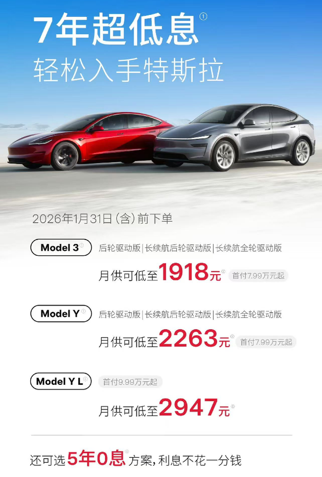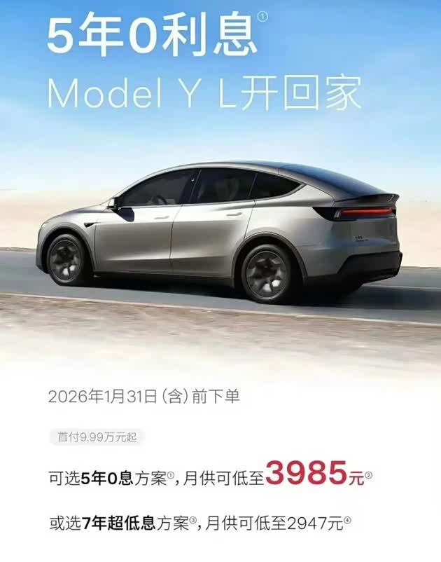 1月6日,特斯拉中国推出限时购车方案,覆盖Model 3、Model Y及 Model Y L全系,2026年1月31日前下单有效。核心福利分两类:7年超低息(年化不足1%)与5年0息,直接免除利息负担。