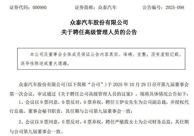而在同日董事会上,《关于聘任公司高级管理人员的议案》同样全票通过,王伊安被聘任为众泰汽车公司副总裁,授权代行总裁、董事会秘书职责,而他曾就职于广汽研究院,并在广州汽车集团股份有限公司,担任规划发展部高级经理。