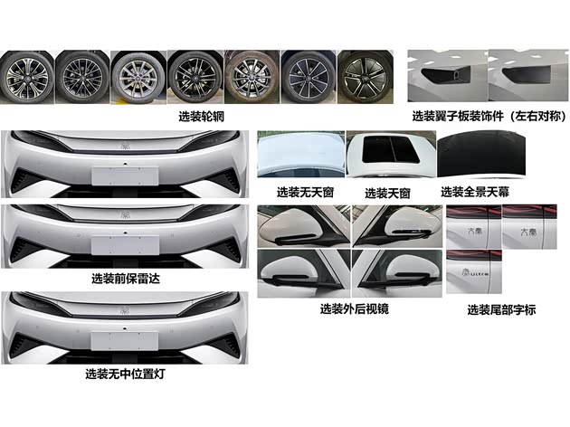 车身尺寸4866/1880/1495mm,轴距2820mm,后排腿部空间充裕且地板纯平。外观延续龙颜设计,配备中国结贯穿尾灯,可选“大秦”“秦Ultra”个性尾标。内饰采用“山水画境”风格,搭载12.8英寸及以上旋转中控屏,高配配备智驾辅助与座椅加热/通风功能。