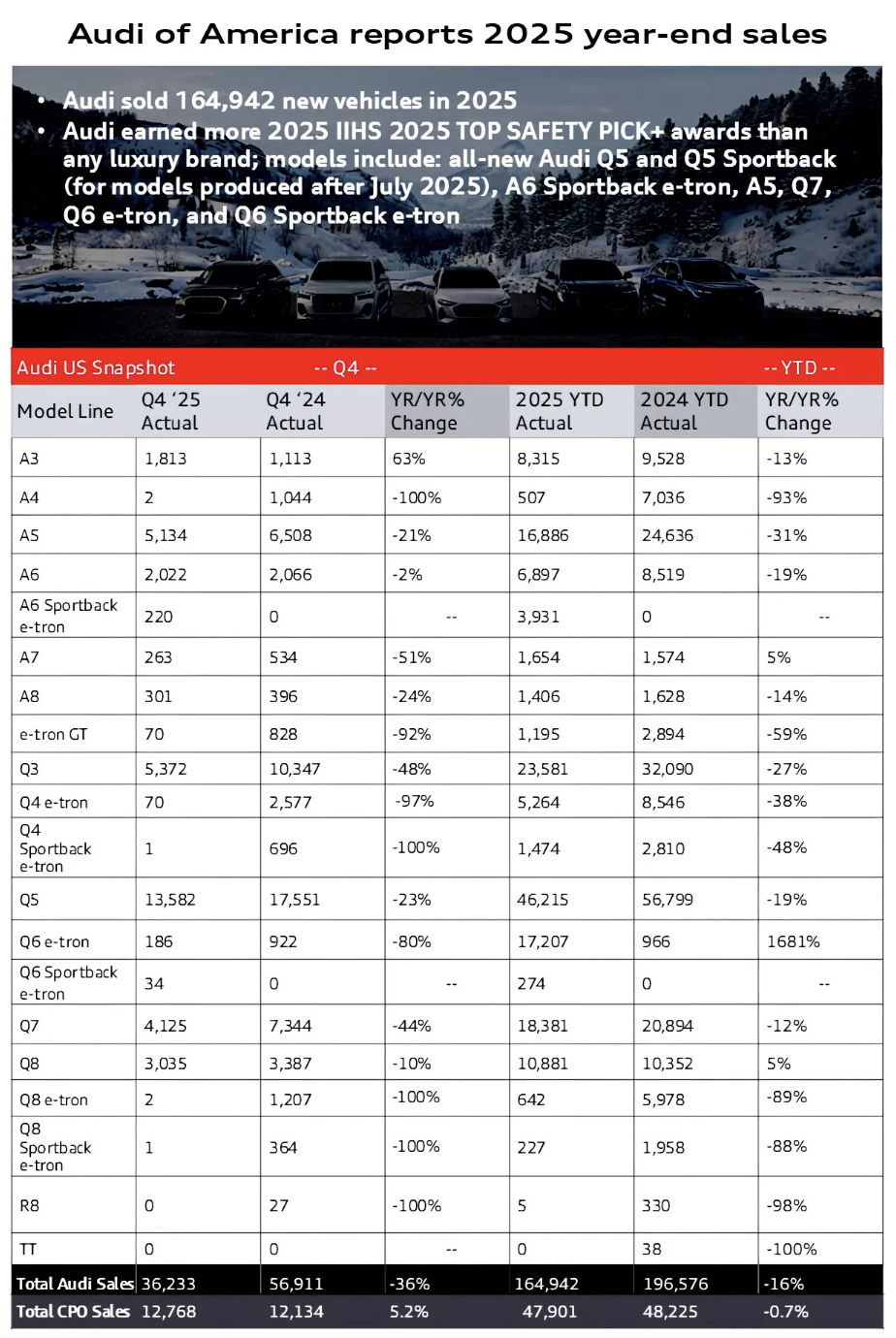 奥迪的销量下降16%,仅为164,942辆,输给了凯迪拉克(173,515辆)、雷克萨斯(370,260辆)和宝马(388,897辆)。奥迪Q7销量在2025年降低12%,仅为18,381辆。相比之下,雷克萨斯TX跨界车的销量则达到57,346辆。奥迪唯一实现增长的车型只有A7(增长5%)和Q8(增长5%)。