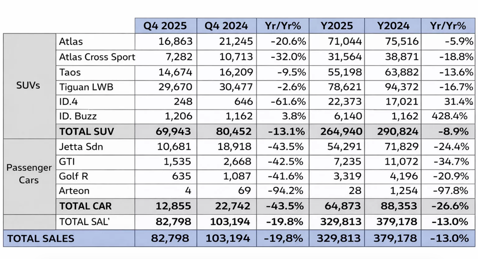 2025年,大众汽车在美国售出329,813辆汽车,同比下降13%,销量甚至不及马自达(410,346辆)。