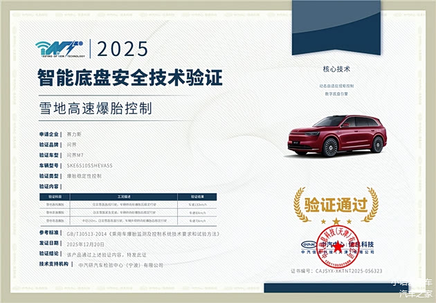 2025年,中汽中心冬季测试场上,全新问界M7在最低达-30℃的极端环境中,一举拿下“综合性能类验证”与“智能底盘安全技术验证”双权威认证。测试涵盖对开路面坡起、雪面爬坡、雪面加速制动、雪面双移线等高难度科目,全新问界M7全程表现稳健,未出现侧滑或溜车,展现出卓越的冰雪操控能力。