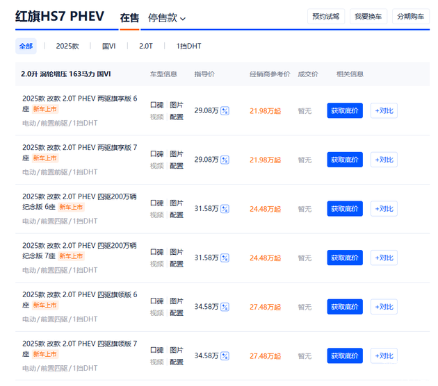 年初伊始,2025款改款 红旗HS7 PHEV正式上市,全系推出6款配置车型,官方指导价区间29.08-34.58万元。新车型涵盖2.0T两驱旗享版、200万辆纪念版、四驱旗领版三个系列,各系列均提供6座与7座两种座椅布局选择,同配置不同布局车型定价保持一致。作为年度改款车型,新车延续前款车型的设计语言与车身维度,核心迭代方向聚焦纯电续航能力优化,同时维持配置体系的稳定性。