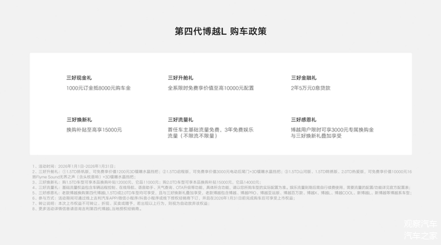 这样一款在造型、空间、架构、智能和安全上全面进阶的车型,其价值门槛却相当务实。第四代博越L的官方指导价区间为9.29万元至11.99万元。更为重要的是,在2026年1月1日至1月31日的权益期内,用户可享受包含“三好现金礼”在内的多重优惠。具体而言,支付1000元订金可抵扣8000元购车金;全系可限时免费获得最高价值10000元的配置升级(如电动尾门、16扬声器音响、3D水晶挡把等);另有最高15000元的换购补贴、2年5万元0息贷款等政策。首任车主还可享基础流量终身免费,以及3年不限流不限量的娱乐流量。