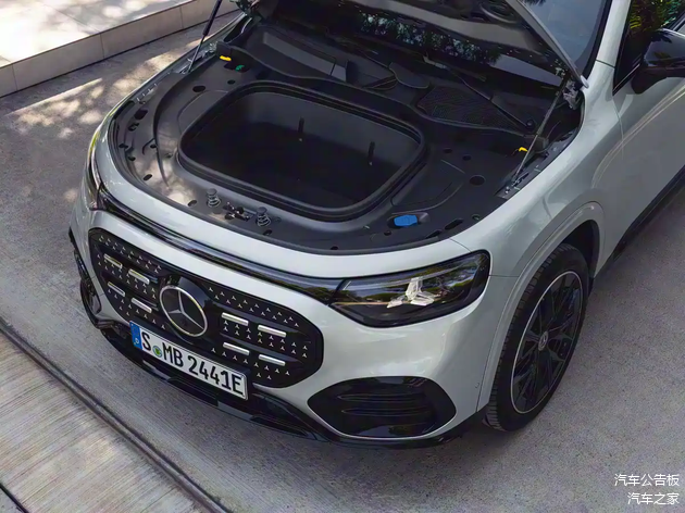 接着我们直接看新车的官图,国产大概率也是这个设计。新车虽然是纯电车,但依旧拥有盾型前格栅,搭配内部的镀铬饰条,大气感和精致感均有兼顾。另外,格栅内部还加入了94颗可动态点亮的LED星徽,估计会很受女性用户的喜爱。当然了,集成三叉星日行灯的LED大灯自然不会缺席,该设计在很多新款奔驰上都能找到,辨识度直接拉满。新车也有前备厢,这一点非常好。