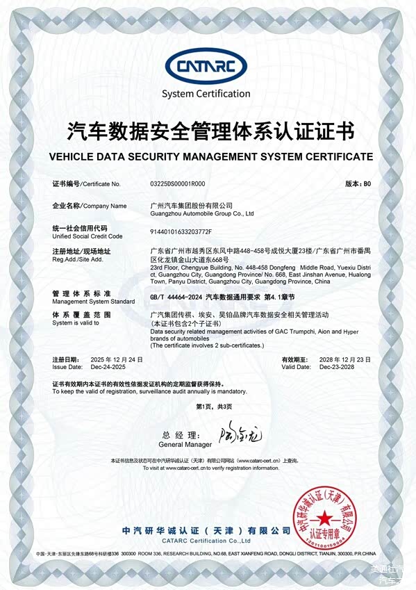 天津和广州2025年12月31日 /美通社/ -- 12月24日,广汽集团在汽车数据安全领域再获权威认可,成功获得行业首张汽车数据安全管理体系认证证书(证书编号:03225DS00001),标志着广汽集团在数据安全体系化建设方面走在了行业前列,为智能网联时代的汽车数据治理树立了全新标杆。