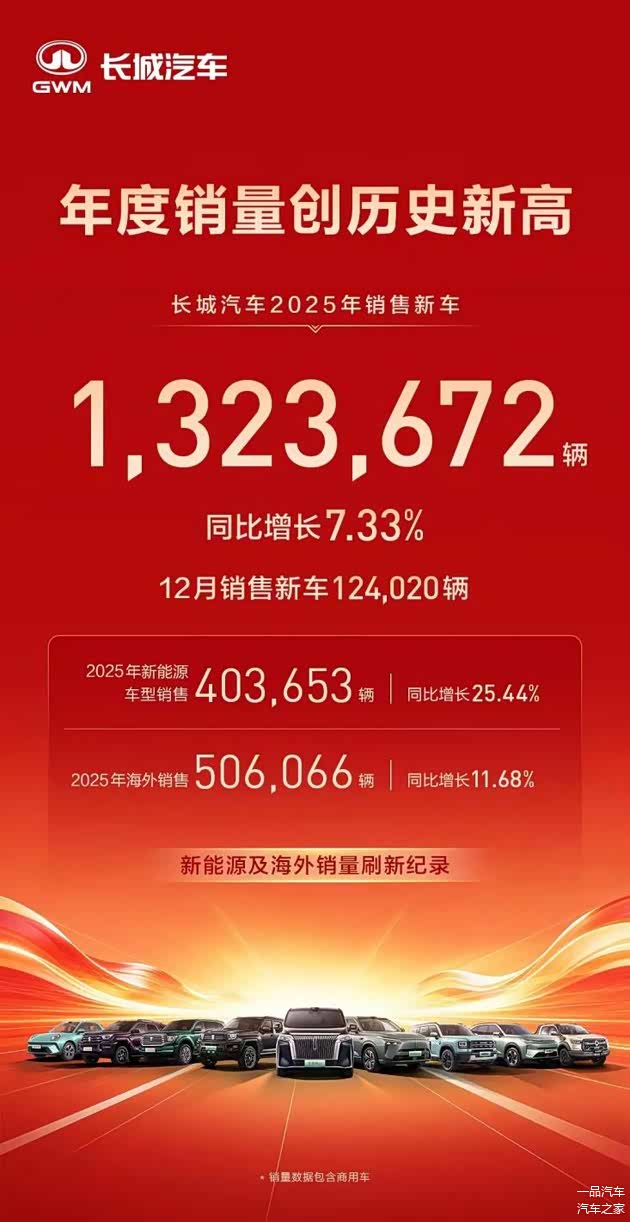 长城汽车则呈现了“稳中求进”的态势,全年销量1,323,672辆,同比增长7.33%。其全年新能源汽车累计403,653辆的数据,显示了在新能源赛道上持续但审慎的投入。