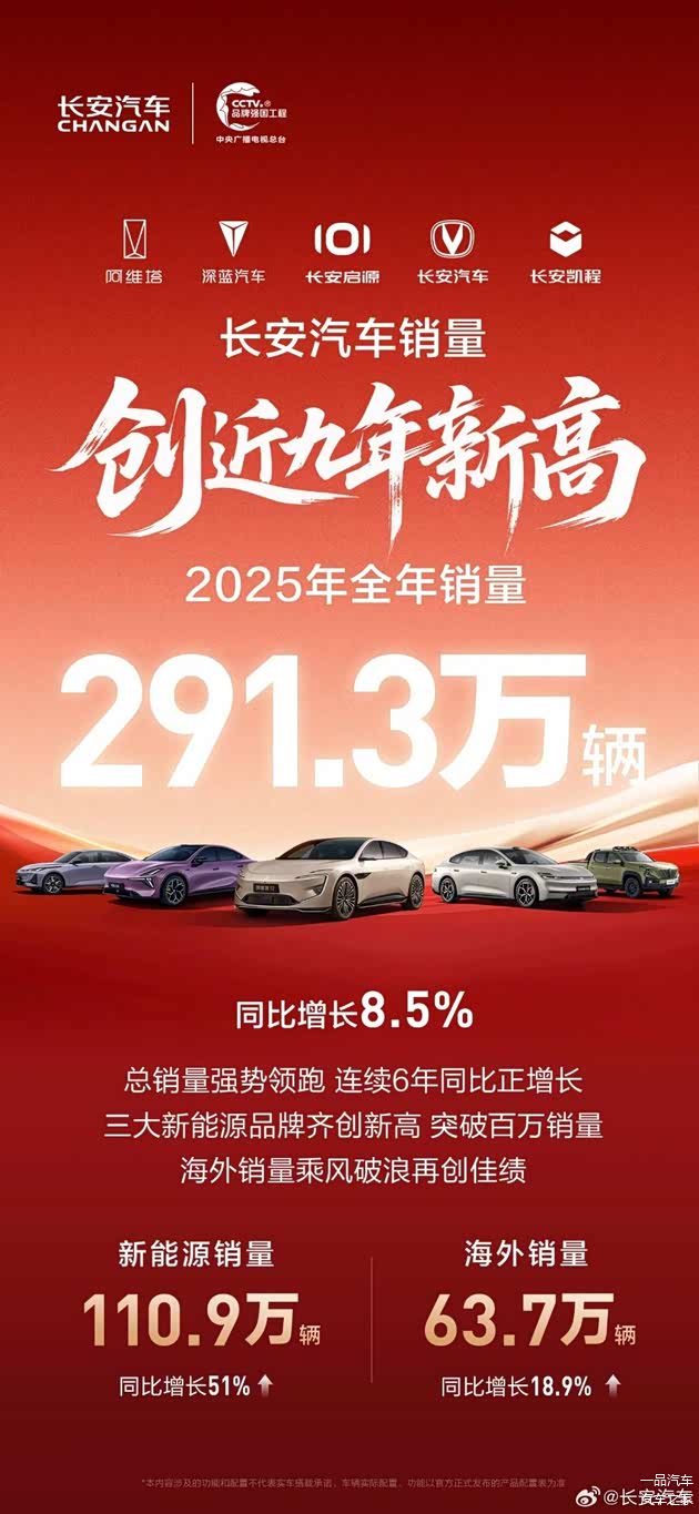 长安汽车全年销量291.3万辆,超额完成280万辆年销目标,同比增长8.5%,同时超过奇瑞集团的280.64万辆,仅次于比亚迪、吉利。从结构看,增长动能主要来自新能源与海外市场,其中新能源贡献110.9万辆,同比增幅达51%;海外63.7万辆,同比增长18.9%。