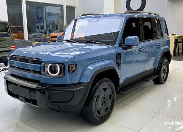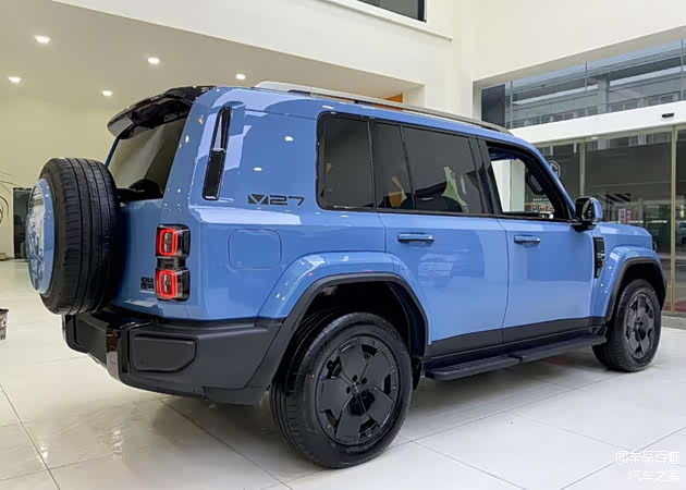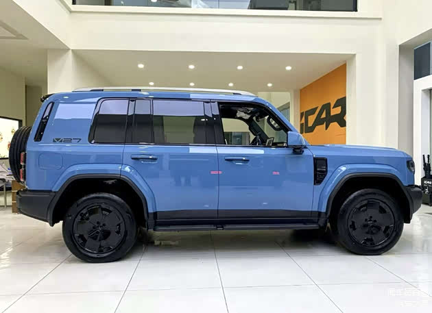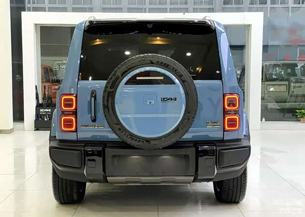与此同时,其方方正正的身形结构中,除了能进一步彰显其方盒子车型的身份属性,还能以宽大全包裹样式的D柱中所透露出的黑色镂空线条以及花瓣样式熏黑半密闭轮毂等设计,来加深其车身的个性成分。而其尾部承接的小幅度弯曲造型,搭配外挂式全尺寸备胎、外延的粗壮后保杠以及两侧悬挂的方形尾灯,则同样能在流露出硬派气息的同时,还不忘带出年轻化审美趋势。