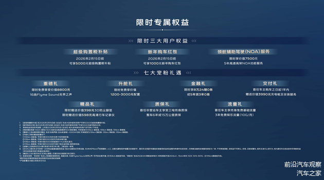 最后,价值感必须体现在最终到手的价格上。2026款星舰7 EM-i四个版型的上市限时指导价为9.58万元至12.38万元,这包含了6000元的限时置换补贴。此外,在2026年2月15日前下定,还能叠加新年购车红包、购置税补贴以及包含免费音响升级、金融免息、赠送充电桩等在内的七大宠粉礼遇。这些权益将车辆的最终拥有成本进一步降低。