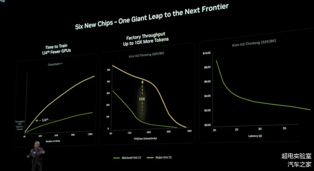 结果就是,相比上一代Blackwell平台,性能提升高达5倍,而功耗仅增加1.6倍。 这使得Vera Rubin架构整体能够在相同时间内训练大型“混合专家”(Mixture of Experts, MOE)AI模型,可将推理阶段的 token 成本最高降低10倍,并将训练混合专家模型(MoE)所需的 GPU 数量减少至原来的1/4。