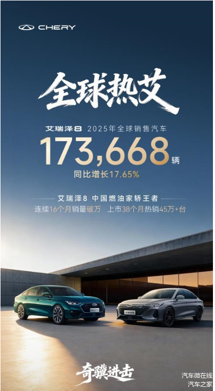 岁序更替,捷报盈门!奇瑞集团正式发布2025年度销量战报,艾瑞泽8家族以全球销售汽车173668辆、同比劲增17.65%的硬核战绩强势收官。家族上市38个月,累计销量突破45万辆,更创下连续16个月销量破万的行业佳绩,在中国燃油家轿市场稳立潮头。这份沉甸甸的销量答卷,不仅印证了艾瑞泽8家族在A+级轿车市场的领军地位,更以实打实的市场认可度,为中国汽车工业向上突破注入强劲动能。