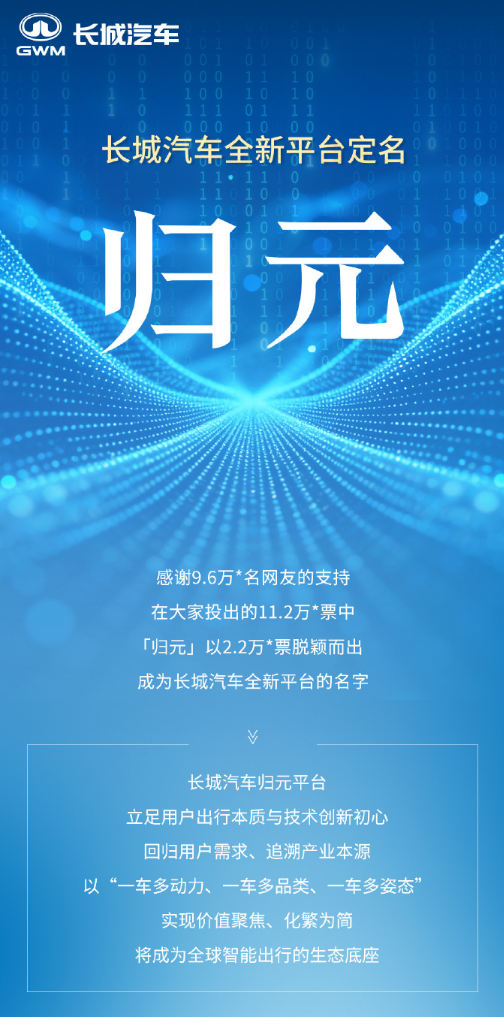 长城汽车全新平台正式定名为“归元”,以2.2万投票数高居榜首,我的理解,名字翻译过来就是不忘初心,不搞花里胡哨,既是回归本心,又是所有都汇聚在一起,各种动力都能承载,混动、汽油、柴油、纯电、氢能,什么场景都能适配。 之前风云电视剧出来的时候,有个大招就叫三分归元气,后来网友加了个后缀七分靠打拼,放在这莫名合适,技术是集大成者,又是长城挑战自我的成果。 投票过程还有个好玩的插曲,驴火这名儿投票数也很高,魏总说要是驴火第一就用驴火,不玩虚的,用户说啥就是啥,太有亲和力了!