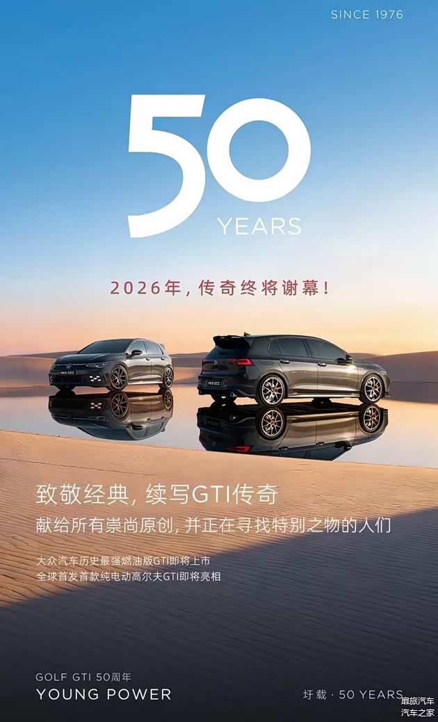 首先图片最上面写着大大的50周年,没错2026年,高尔夫GTI迎来了其50周年纪念日。高尔夫GTI自1976年诞生,历经八代演进,累计产销超250万辆,可以说是“小钢炮”的标杆车型。