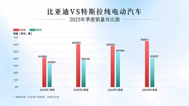 比亚迪的增长动力,很大程度上来自海外市场。2025年,其海外销量首次突破100万辆,在欧洲、南美和亚太等多个地区持续扩大市场份额,逐步成为当地消费者的重要选择。与此同时,从季度表现来看,比亚迪在2025年四个季度的全球纯电销量均领先特斯拉,领先趋势已持续多个季度,体现出较强的稳定性。
