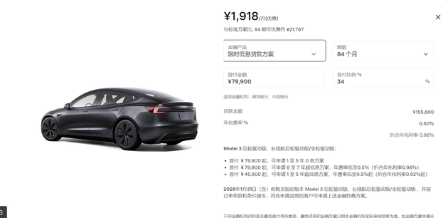 Model YL之前只支持3年免息,现在可以5年免息了;全系列车型支持7年低息政策,首付79900元,月供最低能到1918块钱;不过大家苦苦等待的降价和购置税补贴目前还是没有的。
