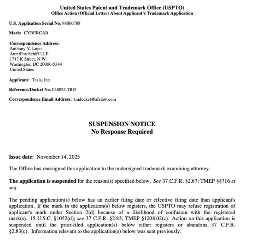 现在“Cybercab”的商标申请也面临审查。美国专利商标局的一份暂停通知显示,特斯拉申请注册“Cybercab”商标已于2025年11月14日正式暂停。