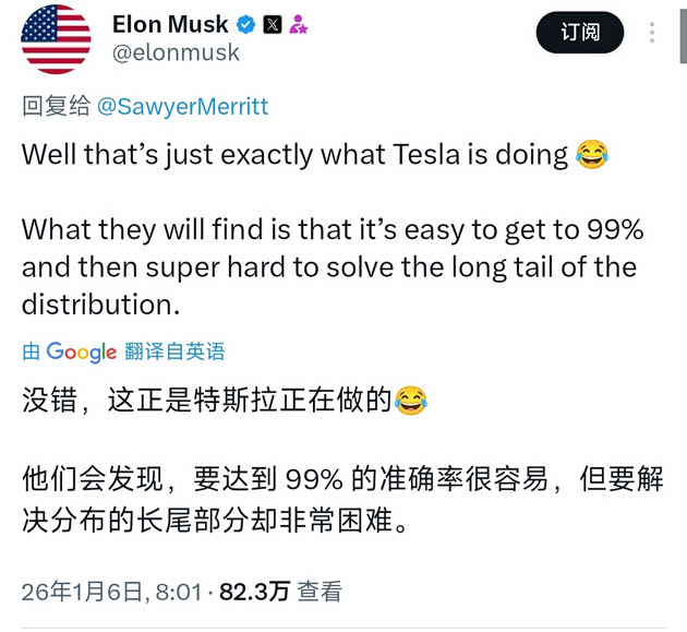 作为自动驾驶赛道的「老对手」,特斯拉创始人马斯克也第一时间对英伟达的这一系列动作作出回应:「好吧,这正是特斯拉在做的。他们会发现,达到99%很容易,但要解决分布的长尾问题却非常困难。」