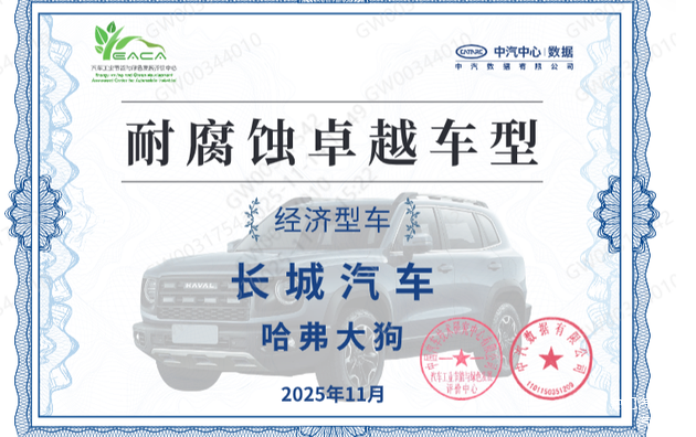 五年间,哈弗狗品类不仅收获了73万用户的坚定信赖,同时也在权威评选中屡获殊荣:其中,哈弗大狗先后荣膺2025年中国燃油汽车用户满意度CACSI测评10-15万紧凑型SUV第一名,以及中汽中心数据测评经济车型“耐腐蚀卓越车型”奖项。这些权威奖项,既彰显了用户对产品质量、售后服务的全面认可,也印证了其在整车工艺、耐久性方面的过硬实力。