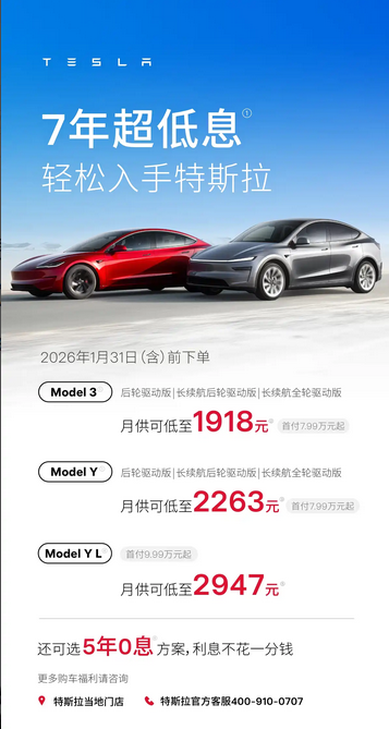 日前,特斯拉此次特斯拉针对Model 3、Model Y以及 Model Y L三款车型同步推出7年低息金融方案,本质上是通过拉长金融周期、降低首付与月供压力,直接干预用户的决策节点。对大多数家庭用户而言,购车并不只是关注裸车价格,更看重每个月的资金占用情况。在7年金融周期下,Model 3、Model Y的首付门槛被压缩到8万元左右区间,这一数字已经接近主流合资紧凑型轿车的首付水平,从心理层面显著降低了纯电车型的“入门压力”。