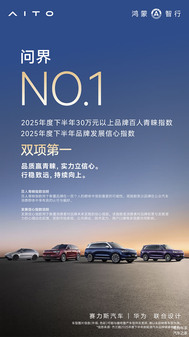 不仅如此,在品牌发展方面,问界更是高端汽车市场中第一个、也是唯一一个连续三次获得品牌发展信心指数第一的品牌。这一成就,清晰反映出市场对问界坚实的技术根基、未来发展前景以及长期价值充满信心。