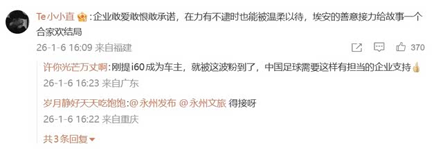 网友纷纷为这一主动接力的姿态点赞,并对“续写”的具体形式展开想象:有人认为可能会延续“送车”承诺,毕竟这是汽车企业的天然优势;也有人推测或将通过赞助等形式支持球队发展,这与埃安长期投入体育事业的形象相符;亦有人期待为球员提供更具意义的成长支持。尽管形式尚未明确,但公众普遍认为埃安的善意接力,或将给故事一个合家欢结局。