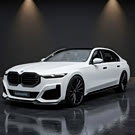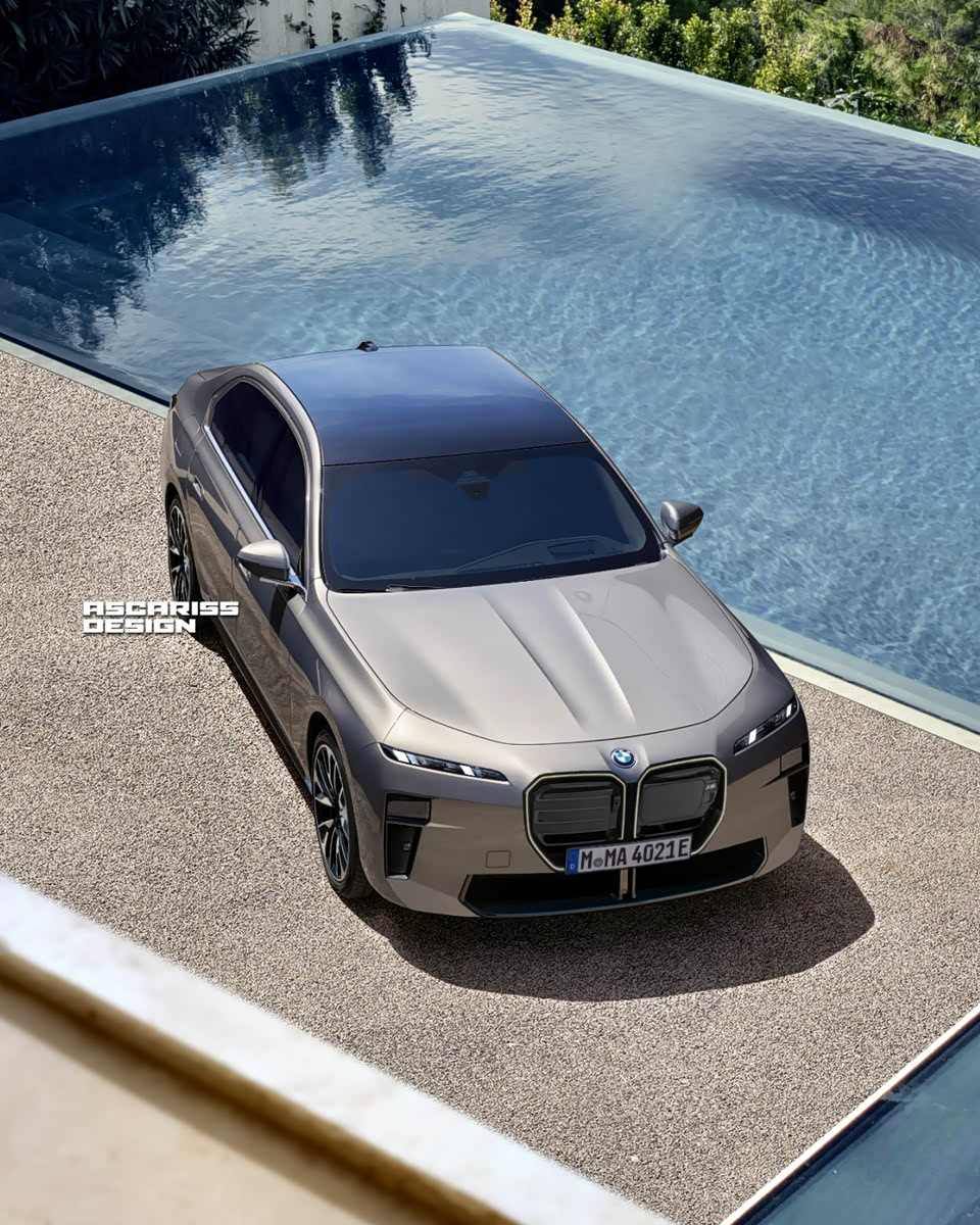 新款宝马7系假想图,假想图采用了新的前脸设计,整体的造型感觉非常漂亮,动力上有望3.0T直列6缸发动机,这是中期改款,有望在2026年发布。从前脸来看,视觉效果比较有气势,提供连体的大尺寸双肾格栅,内部带有横条式的造型,视觉效果非常有气势,前大灯组采用了细长的设计,有着精致的高级感,前包围采用了硬朗的格栅,也是呈现出大气豪华的设计。侧面采用了平直的车身设计,依旧是非常大气,假想图采用了大尺寸的黑色轮毂造型。