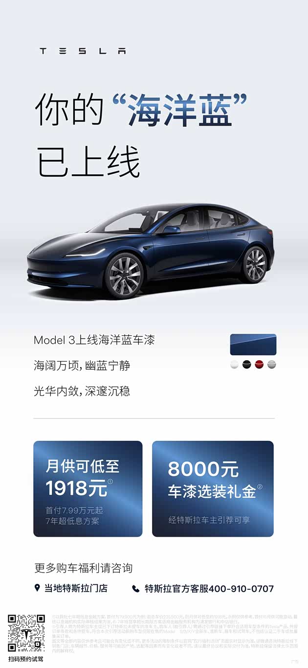 最后,特斯拉 Model 3 上线海洋蓝车漆,选装价格为 8000 元。