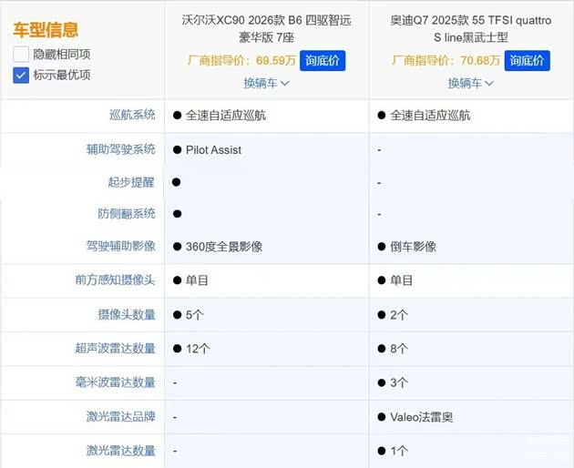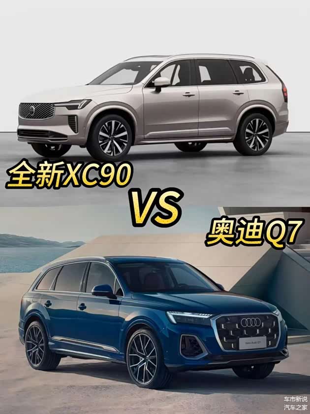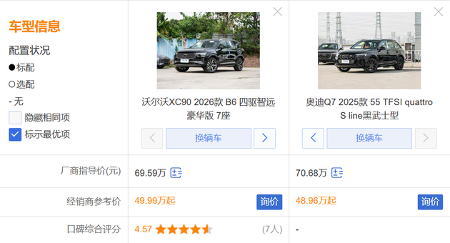 为了让大家更直观了解两款车的差异,我们选取了指导价为69.59万元的沃尔沃全新XC90 2026款 B6 四驱智远豪华版 7座(下文简称:沃尔沃全新XC90),以及指导价为70.68万元的奥迪Q7 2025款 55 TFSI quattro S line黑武士型(下文简称:奥迪Q7)。这两款车型大家关注度高且终端价格相近,同时也都在配置、驾乘体验和品牌力上具备很强竞争力。到底选谁更合适?看完就明白了。