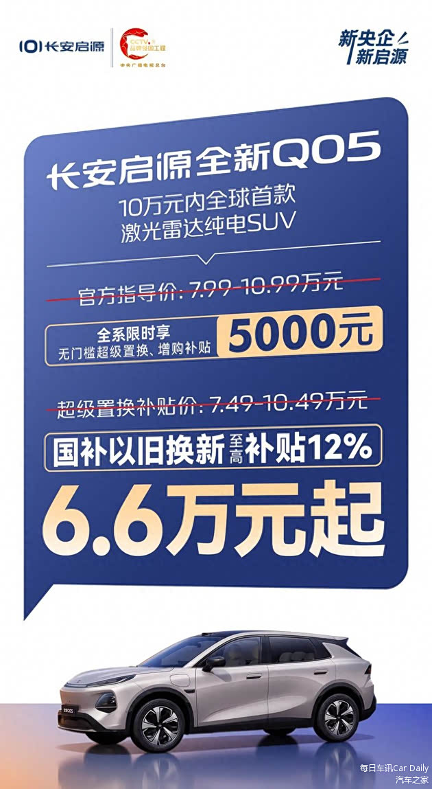 今年一上来,先热的不是哪款新车,而是“以旧换新”的新国补。报废或置换一台旧车,最高能拿到2万元补贴,这种力度很难不动心。长安启源就是第一批抓住风口的车企之一,它直接把一台带激光雷达的纯电SUV——全新Q05,硬生生做到“6.6万元起”。在10万元之内,长安想借这台车,重新定义家用纯电SUV。