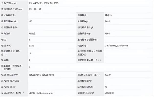 从申报数据可知,新车车身尺寸维持原样,长宽高为4455/1875/1615mm,轴距2720mm。轮圈有18英寸可选,轮胎规格提供215/55 R18与235/50 R18两种。尺寸不变,意味着平台和车身骨架大概率沿用现有体系,改动重点预计在三电、配置和细节工程优化上。