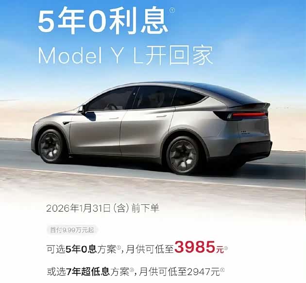 Model Y L首次推出5年0息,首付9.99万起,月供可低至3985元。