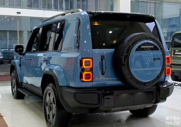 来到车尾,双方形竖置尾灯的设计和路虎卫士有异曲同工之妙,让人一眼就能记住。侧开式尾门和外挂式备胎,进一步强调了它硬派越野的身份。要是你觉得还不够个性,还能选装“小书包”储物箱,既实用又好看。底部后包围和前脸相互呼应,还配备了拖车钩,以后出去自驾游,拖个房车啥的都不在话下。