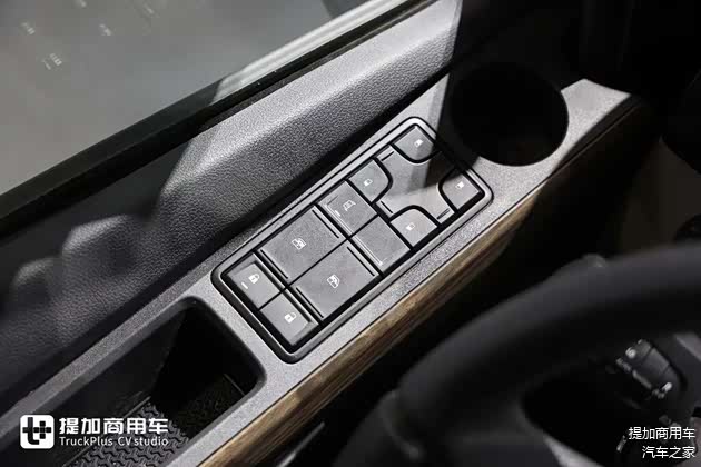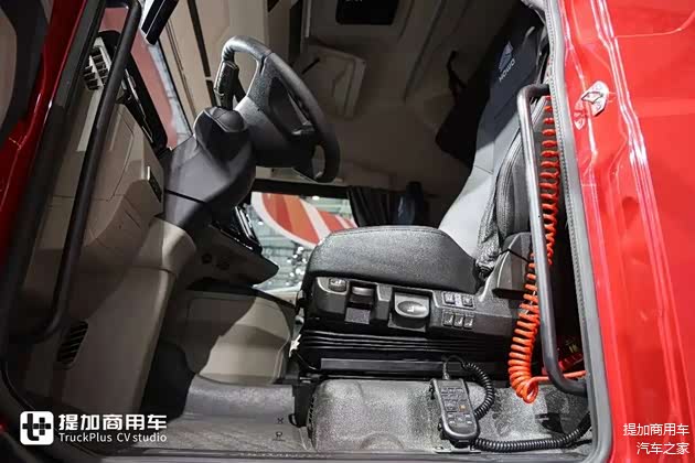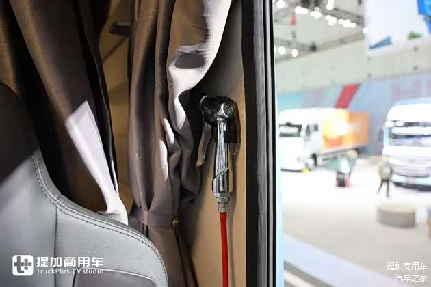 主副驾全部采用气囊减震座椅,可能是因为展车所以配置如此之高,如果是正常销售的话标准版本应该是主驾气囊副驾折叠座椅。主驾气囊座椅采用伊思灵NTS870气囊减震座椅,这也是高端重卡上的明星座椅产品,有阻尼调节、通风加热、腰部支撑、坐垫长度调节等等一系列功能。