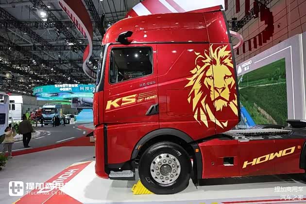 豪沃KS的驾驶室白车身是在汕德卡曼技术模具的基础上进行升级而成的,但是它换了一套全新的覆盖件这就导致你不仔细去观察各个零部件的比例就很难去发现这个问题,但是如果看车顶,包括保险杠与格栅的尺寸比例,也还是能发现一部分身影的。豪沃KS的侧面带了拉花,有英文标识和狮子头像,狮子头像,你细品。